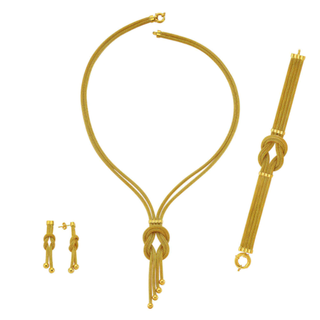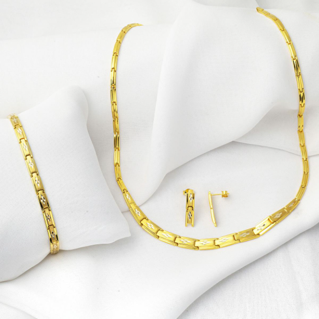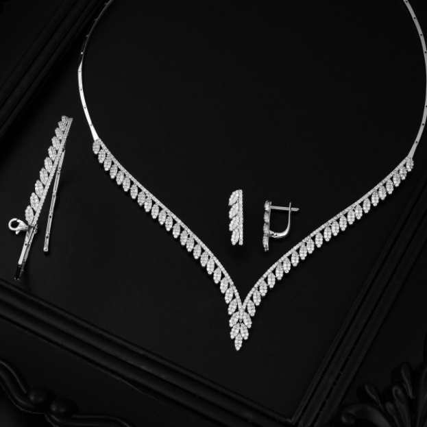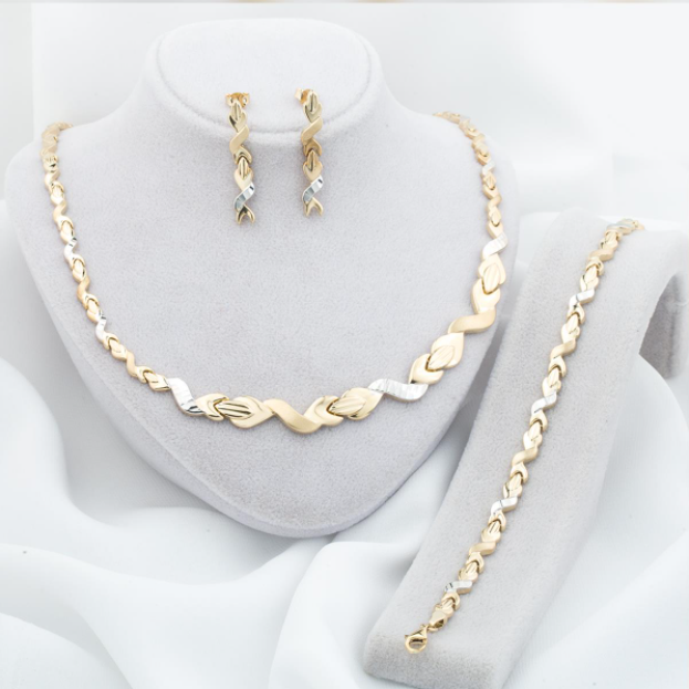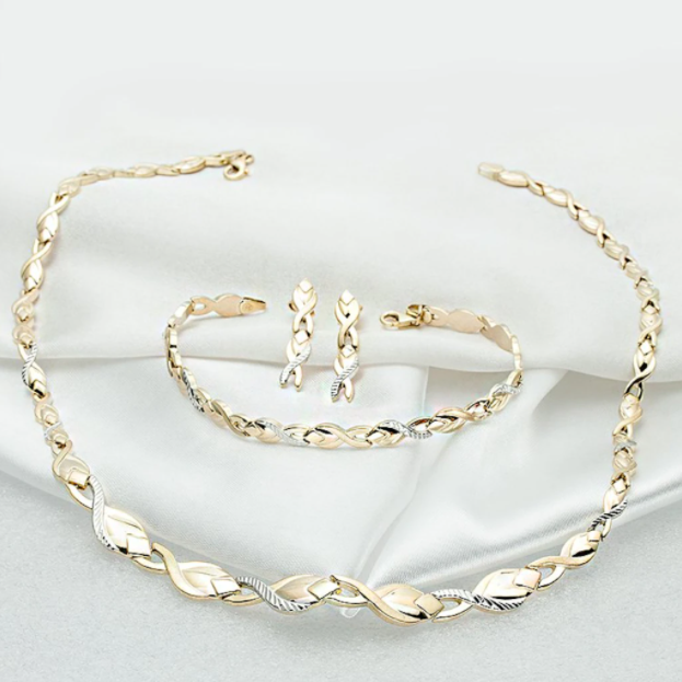 Düğün altın takımı modelleri en çok dikkat çeken modellerden birisi iç içe geçmiş gibi görünen yaprak modelleridir. Bu yapraklar oldukça şık ve hoş bir görüntü sağlamaktadır. Altın renginden yapılmış olan bu kolye modeli içerisinde gümüş ve pembe altın rengi de bulunmaktadır. Beyaz rengi sayesinde gelinlikle uyumlu olacaktır. Pembe rengi ile kolyeye farklı bir hava katacaktır. Kolye, bileklik ve küpe bir takım halinde olduğundan oldukça şık bir görünüş edineceksiniz.