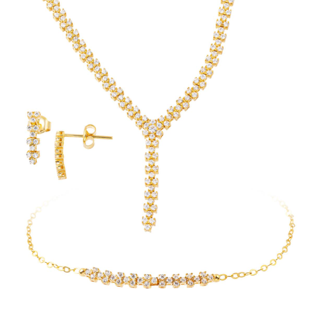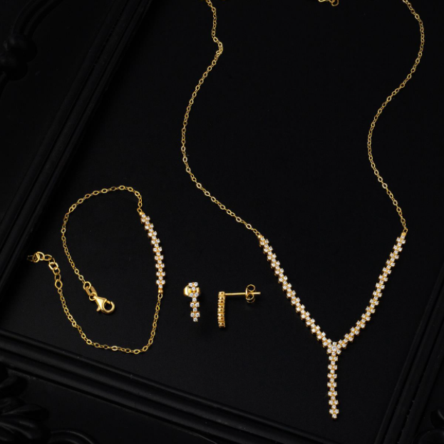 En son modelimiz taşlı sevenlere gelsin. Bu düğün takımında çok fazla taş kullanılmıştır. Ancak arka rengi altın sarısı olduğundan oldukça şık bir görüntü de elde edilecektir. Beyaz pırlanta taşlar sayesinde oldukça şık görünen bir modeldir. Kolye ince bir tasarım olmasına rağmen uzunluğu sayesinde dikkatleri oldukça üzerinde toplamaktadır. Eğer daha fazla ve farklı kolye modelleri görmek isterseniz o zaman galerimizde bulunan diğer modellere bakabilirsiniz. Bu sayede daha fazla fikriniz olacaktır. En beğendiğiniz modeli ise yorumlarda belirtmeyi unutmayın!