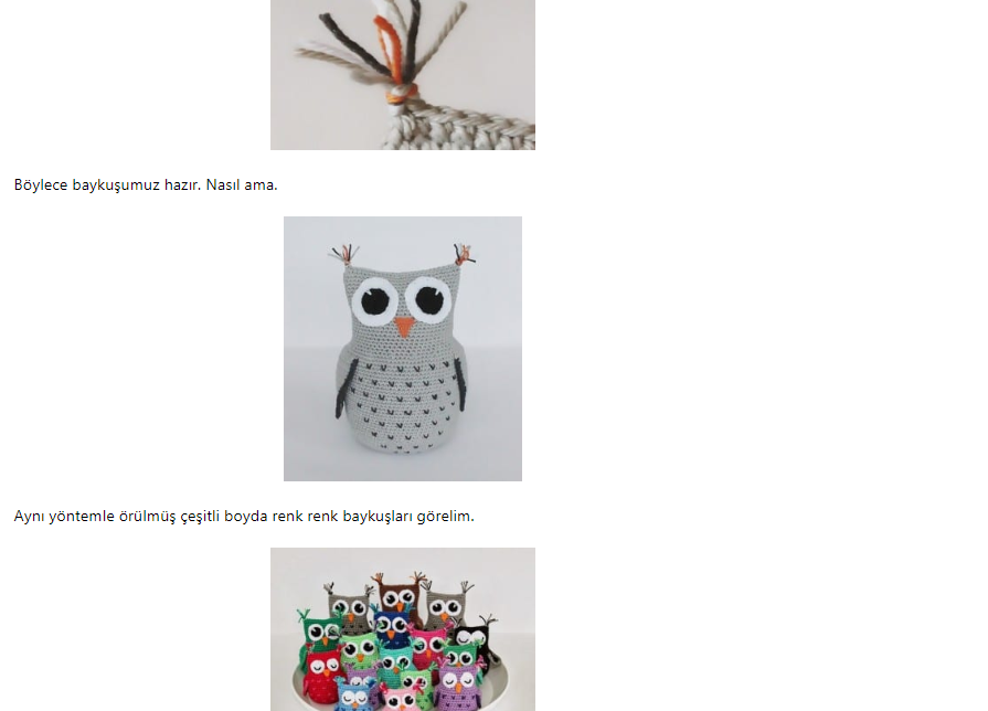 Hepinize merhaba arkadaşlar. Bugün sizlere oldukça güzel bir amigurumi baykuş tarifi vereceğiz.  Bu tarif ile sizler de sevdiklerinize ya da kendinize amigurumi baykuşlar yapabilirsiniz. Bu baykuş tarifinin en güzel yanı ise görselimizde gördüğünüz gibi birden fazla yapmanıza rağmen küçük değişiklikler yaptığınızda birbirlerine benzemeyecek bir model olması. Bu şekilde sevdiklerinize istediğiniz kadar yapabilirsiniz. Hatta özellikle kardeşleriniz varsa bu tarifi şiddetle öneriyoruz. Örneğin 3 kardeşsiniz. Ve 3 farklı amigurumi baykuş yaptınız. Bir araya geldiğinizde onlara bundan hediye edebilir ve kardeşlik bağlarınızı bu vesileyle güçlendirebilirsiniz. Başka olaylarda bir araya geldiğinizde çocuklarınız oynasın diye bu amigurumi baykuş oyuncağını da yanınızda getirirsiniz ve hem siz hem de baykuşlar tekrar bir araya gelmiş olurlar.
