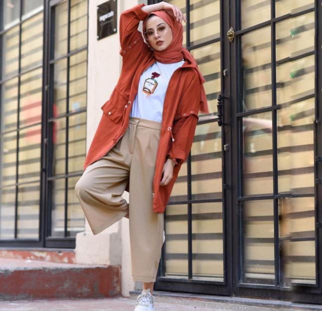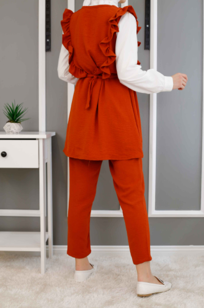 Tesettürlü bayanlar için ise kiremit renkli kombinler daha da çok seçenek sunmaktadır. Bunun en güzel örneklerinden birisini hemen yukarıda görebilirsiniz. Kiremit renkli yelek ve pantolon takımı oldukça şık görünmektedir. Bu yeleğin içine beyaz renkli bir gömlek konulmuştur. Bu sayede kiremit rengi daha ön plana çıkarken genel olarak daha aydınlık bir görünüş elde edeceksiniz. Bu kombini kullanacaksanız o zaman baş örtünüzü de bej renklerinde seçebilirsiniz. Aynı şekilde çanta ve ayakkabınızı da bu renklerden seçerek daha uyumlu bir görüntüyü elde edebilirsiniz.