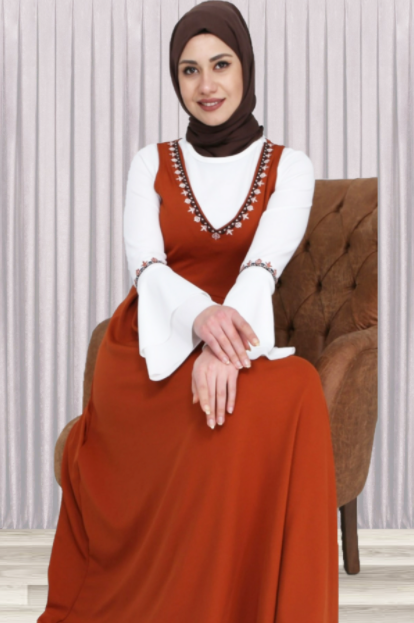 Son olarak ise kiremit rengi elbise modellerine bir bakalım. Bu modellerde de göreceğiniz gibi kolları katlanan modellerden tercih edilmiştir. Ayrıca bu sayede hem serin ilkbahar akşamlarına hem de sıcak sabahlarına uygun bir kıyafet olmuştur. Beyaz düğmeleri ve siyah kemeri sayesinde her iki renkle güzel bir uyum sağlanmıştır. Diğer kombin örnekleri için görsellerimize bakmayı unutmayın!