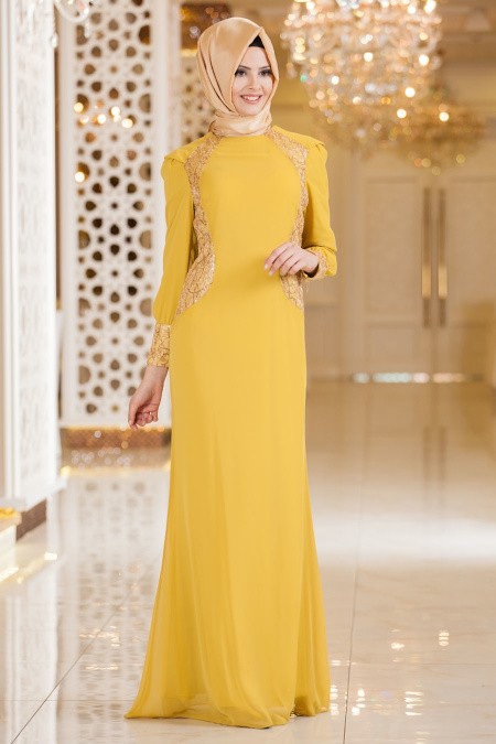 Düğünler İçin Sarı Tesettür Elbise Kombinleri
