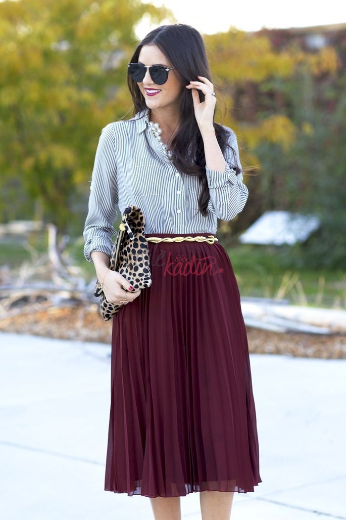 1) KUTU PİLELİ ETEKLER : Mütevazi uzun kutu pileli etek ofiste rahat dolaşmak ve resmi görüntü için kullanabilir. Kutu pileli etekler kalın kumaşlarda yayılır. Ayrıca bu pileli etek tarzını ütülemek mantıklı olacaktır.