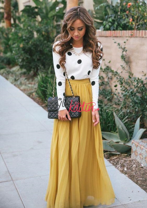 Kendine özgün bir kombin yaratayım derseniz de uzun etek üstüne tişört ve kendinize has takılarınızla zenginleştirerek özgünlüğü yakalayabilirsiniz. Kombinlerinizi yaparken hem alta hem de üste canlı renkler kullanmanız sizi bambaşka gösterecektir.Canlı renkler her zaman bir adım öndedir.Bunun yanında aksesuarlarınızın canlı olması da güzel olacaktır. İlkbahar ve yaz mevsiminde renkler,mevsime daha çok uyum sağlamış olacak. Bu mevsimlerde doğa canlanır sizlerde doğaya uyum sağlamış olursunuz.Vücut tipinize göre uygun kesim bulmanızı öneriyoruz.Uzun etek modellerimiz kombinlerimiz için galerimize bakalım. 2020 Pileli Etek Modelleri ve Kombinleri