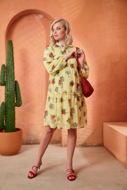 Bir diğer sarı elbise modeli ise tabii ki sarı puantiyeli pembe elbisedir. Puantiye desenleri çok büyük olduğu için sarı elbise gibi görünmektedir. Ancak üzerindeki yuvarlak baskısı ona oldukça çocuksu bir sevimlilik katmıştır. Omzu açık olsa da küçük boyun askıları bulunmaktadır. Bu da oldukça farklı bir görüntüye sahip olmasını sağlamıştır. Beli kendinden kemerli olduğundan yaka kısmı bol olmuştur. Bu sayede göbeğiniz varsa gizlemeniz kolaylaşacaktır.