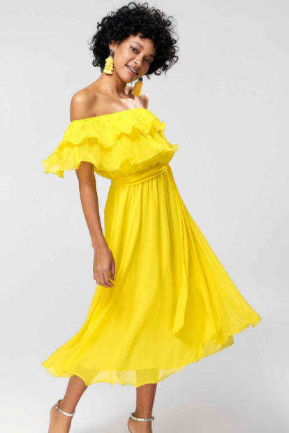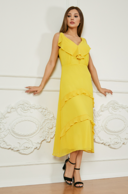 Farklı sarı elbiseler nelerdir hemen bakalım. Bu görselimiz daha çok şıklığı ve zarafeti arayan kadınlar içidir. Görselde de gördüğünüz gibi göbek açık bir elbise modelidir. Buradaki açıklık elbisenin dikimi ile sağlanmıştır. Ayrıca üzerindeki boncuk çiçekler sayesinde daha günlük bir model gibi görünmektedir. Bu modelin eteği uzun olduğundan dolayı eğer kısaysanız tavsiye etmiyoruz. Uzun etekler genellikle kısa bireyleri daha da kısa göstermektedir. Bundan dolayı boyunuz uzunsa bu sizin için mükemmel bir elbise olacaktır.