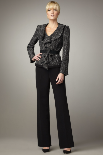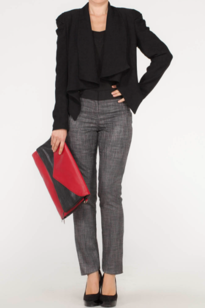 Bir diğer iş mülakatı kombini ise siyah ve pantolonlu olan bir modeldir. Bu modelde üzerinize tam oturacak dar kalıp bir ceket bulunmaktadır. Bu ceket sayesinde oldukça şık görüneceksiniz. Görselde gördüğünüz gibi boru paça kot pantolon ile kombinlenebilir. Ancak biz size kot yerine kumaş tarzı pantolonlarla kombinlemenizi tavsiye ederiz. Kumaş pantolon işinizi daha çok bildiğinizi gösterecektir. Küçük bir el cüzdanı gibi çantalarla da oldukça şık görüneceksiniz.
