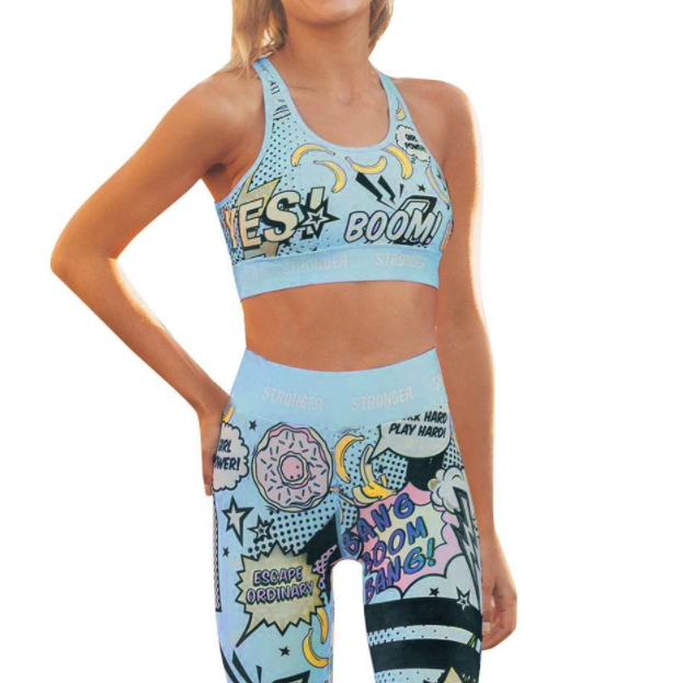 Eğer biraz daha eğlenceli bir kıyafet takımı istiyorsanız o zaman mavi olan spor kıyafetine bakabilirsiniz. Bu spor takımının askıları çok daha kalındır ayrıca göğüs altındaki bant da geniştir. Bu sayede vücudunuzu çok daha iyi saracaktır. Taytın kemer kısmı da geniştir. Bu yüzden spor yaparken belinizden kayıp düşme ihtimali azalmaktadır. Üzerindeki görsellere baktığımızda ise çok farklı çizimleri olan bir model olduğunu görmekteyiz. Donat ya da çizgi romanlardan fırlamış gibi görünen yazıları oldukça şık bir hava vermiştir. Kadın spor kıyafetleri görsellerimizde de göreceğiniz gibi bu kadarla sınırlı değildir. Kimi kıyafetler sutyenli iken kimileri ise uzun kolludur. Görsellerimizden bakmaya devam edebilirsiniz.