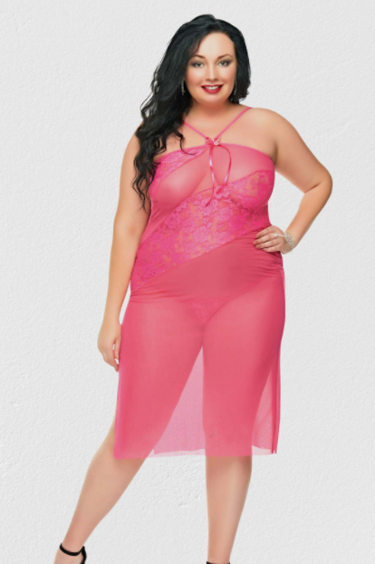 Bir diğer pembe gecelik ise yukarıda gördüğünüz büyük beden gecelik modelidir. Bu gecelik modelinde siyah ve pembe bir arada kullanılmış ve oldukça seksi bir görünüm kazandırılmıştır. Kumaş kullanılmak yerine tamamen dantelden yapılmış bir modeldir. Bu sayede transparanlık artmış ve daha seksi bir görünüm elde edilmiştir. Göğüs kısmındaki ikinci bir dekolte detayı ise oldukça şık durmuştur. Bu iki sutyen kısmının ortasında pırlanta taşlı küçük bir süs de bulunmaktadır.