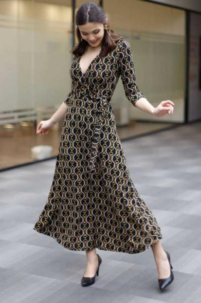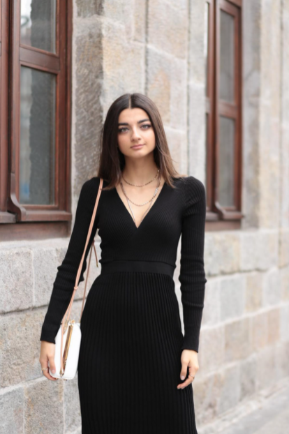 Kış mevsimine uygun V yaka model elbiseler nelerdir diye görsellerimize bakalım. Hemen oldukça dikkat çeken siyah bir elbise modeli dikkatimizi çekmektedir. Bu elbise modeli tamamen siyahtır. Ancak etek ve üst kısmının kumaşı farklı şekilde dikilmiştir. Alt kısım uzun şeritli olacak şekilde dikildiğinden çok şık bir görüntü elde edilmiştir. Bu modelde ayrıca kemer kısmı da bulunmaktadır. Dar kesim bir elbise modelidir. Bundan dolayı eğer kilolarınızla ilgili görüntünüze takıntılı iseniz bu modeli kullanmanızı tavsiye etmeyiz. Bunun nedeni dar olduğu için göbek kısmı gibi pek çok kısmı öne çıkaracaktır. Ancak kilolarınızla sorununuz yoksa ya da kilolu değilseniz o zaman bu model size çok yakışacaktır.