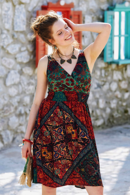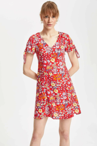 V yaka elbise modelleri nedir diye bakıyorsanız hemen görsellerimizle başlayalım. Görsellerimiz arasında V yaka olan fırfırlı mavi elbise modeli oldukça şık bir modeldir. Arka plan mavi olduğundan dolayı önündeki elbise mavi gibi görünmektedir. Yakası fırfır desenli dikildiği için eğer göğüsleriniz küçükse ve daha büyük görünmesini istiyorsanız bunu kullanabilirsiniz. Fırfır göğüs bölgenize bir kabarıklık katacak ve büyük gibi gösterecektir. Ancak göğüslerini büyükse bu sayede daha da büyük görünecektir. Bu modelin desenleri ise oldukça küçük ancak sıktır. Üzerlerinde kırmızı ve beyaz çiçek desenleri bulunmaktadır. Bu da elbiseye çok şık bir hava katacaktır. Ayrıca elbise mini bir modeldir. Yani yaz aylarında sıklıkla kullanmak isteyeceğiniz kadar şık görünmenizi sağlayacaktır.