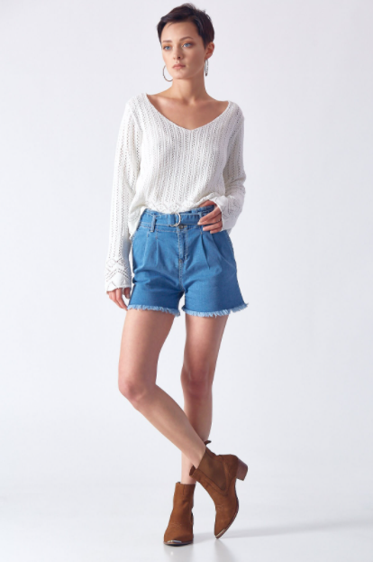 Bir diğer yüksek bel kot şortu nedir diye hemen yukarıdaki görsele bakalım. Buz mavisi oldukça şık kot şort sayesinde kombinlerinizi kolaylıkla yapacaksınız. Model gibi siyah renkli kıyafetlerle kombinleyebilirsiniz. Ayrıca beyaz gibi açık renkleri de kullanabilirsiniz. Bu buz renkli şort ince olduğundan dolayı yazlık kullanıma çok uygundur. Ancak ilkbahar ya da sonbaharda giymenizi tavsiye etmeyiz. Beli yüksek olduğundan dolayı kolayca kombinleri yapabilirsiniz.