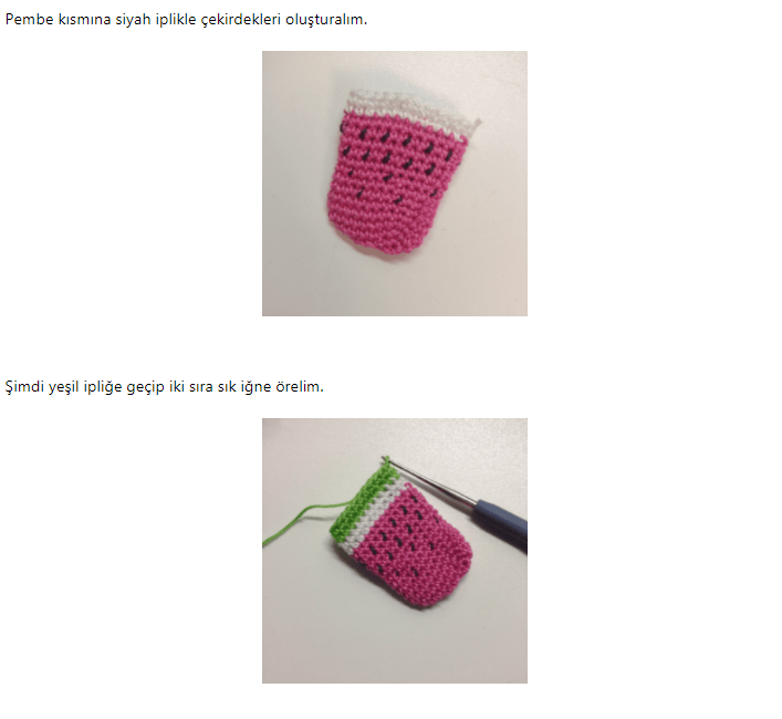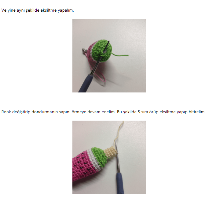 Her amigurumi gibi aslında bu da bir oyuncak. Eğer çocuğunuz bu tür besinlerle oynamayı seviyorsa size tavsiyemiz bundan ona bir tane yapmanız. Kendi mutfağındaki eşyalarının yanında bu tür bir amigurumi dondurma oyuncak olursa hayali arkadaşlarıyla olan buluşmalarında bunu kullanabilir. Eğer daha önce amigurumi oyuncak bebek yaptıysanız bu amigurumi karpuz şekilli dondurmayı onun eline de dikebilirsiniz. Özellikle yaz elbiseleri içinde olan bir oyuncak bebek için oldukça sevimli olacaktır. Eğer daha önce amigurumi oyuncak bebek yapmadıysanız o zaman sayfamızdan birbirinden farklı ve güzel amigurumi oyuncak bebek modellerine bakabilirsiniz. Bu şekilde iki farklı amigurumiyi birleştirmeniz oldukça güzel olacaktır.