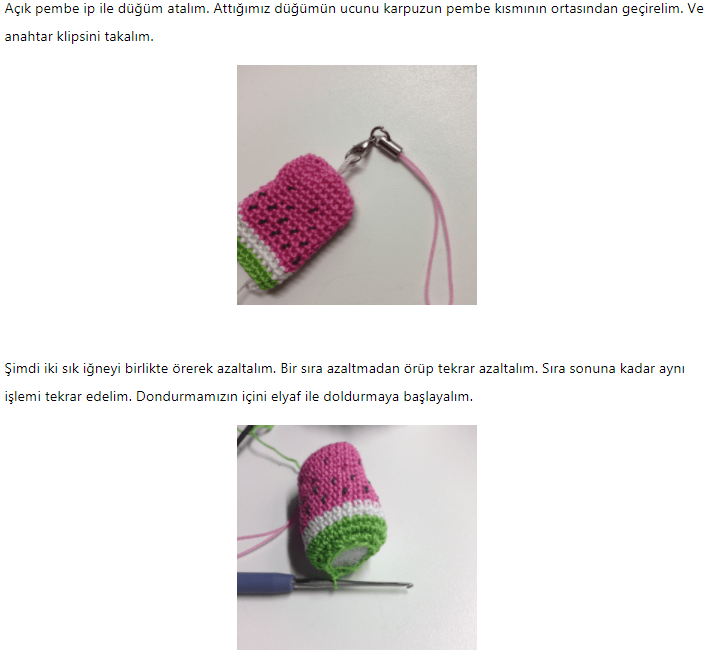 Amigurumi dondurma anahtarlık tarifi yalnızca anahtarlık yaparken yalnızca anahtarlık yapmak olarak bakmamalısınız. İsterseniz çanta süsü de yapabilirsiniz. Bu tarifi yapmak için gereken malzemeleri saymak gerekirse pembe, beyaz, yeşil, siyah ve beyaz amigurumi ipleri lazım. Bu bir karpuzlu dondurma modeli olduğu için bu renkleri tercihe diyoruz. Eğer siz başka renklerde yapacaksanız o renkleri de kullanabilirsiniz. Bu ipleri örmeye uygun tığ ikinci lazım malzemeniz. Ve tabii ki makas ve anahtarlık klipsi. Bu klipsleri ucuzluk pazarlarından rahatlıkla bulabilirsiniz. Bu şekilde malzemelerimizi hazırladıktan sonra örmek için tarife başlayabilirsiniz.